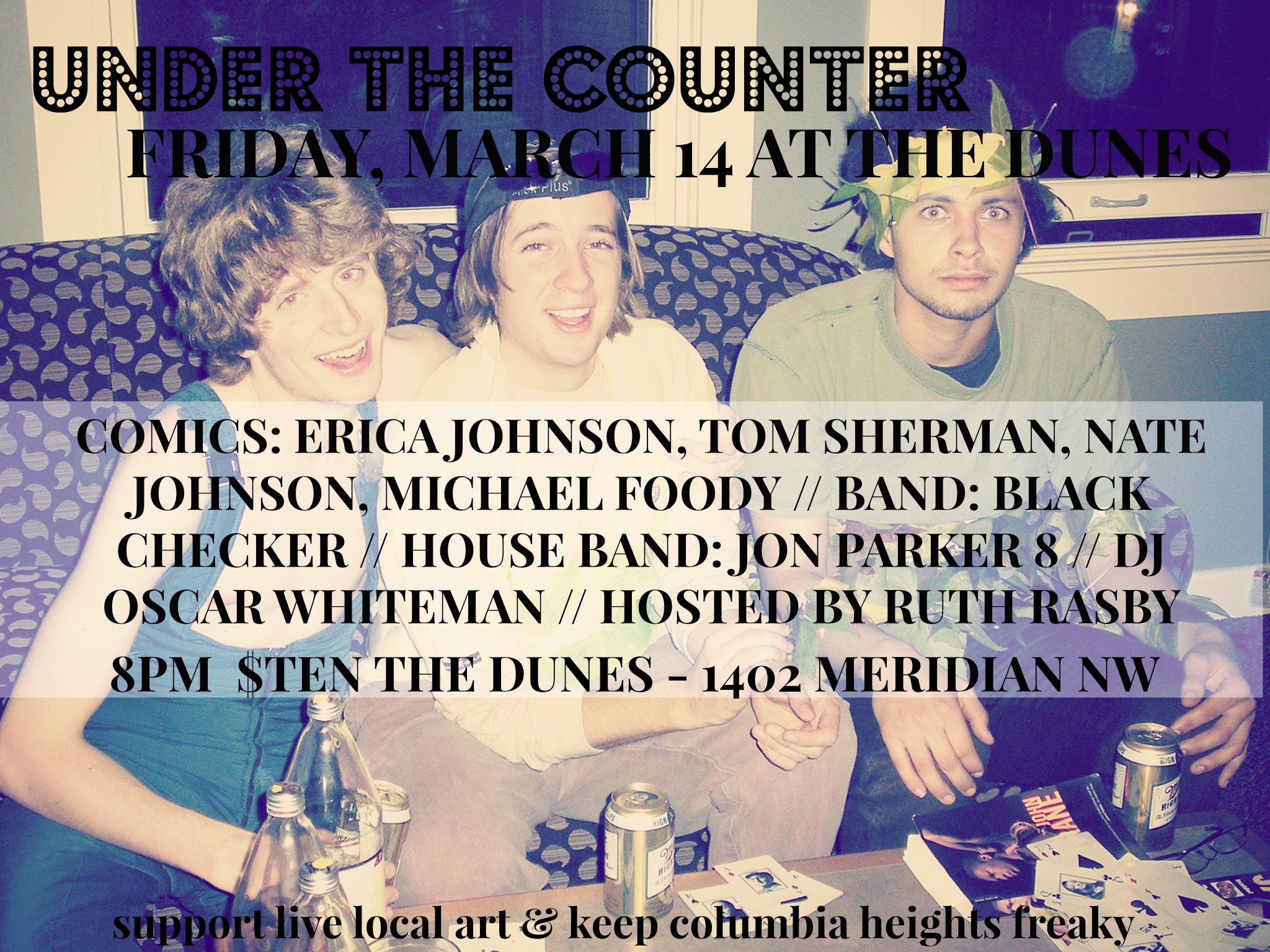 The monthly comedy + jazz + indie rock night Under The Counter returns to The Dunes in Columbia Heights this Friday night!