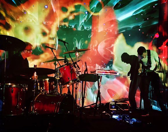 “The sound travels between quiet string and ambient key pads to immense drones with psychedelic riffs and pounding beats. Vivid, large scale visual projections are manipulated in real time as an integral component of each composition resulting in an immersive, cinematic experience.”