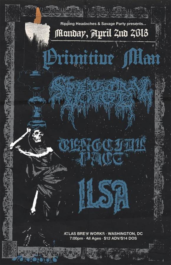DC area metal shows seem to have found synergy with the city’s indie brewing works. Monday night Atlas Brew Works hosts two Colorado bands, Primitive man and Spectral Voice, and two hometown gems, Ilsa and Genocide Pact. If the phrases “Home Is Where The Hatred Is”, “Eroded Corridors of Unbeing”, “Corpse Fortress” and “Order of Torment” speak to you, then you know where you need to be.