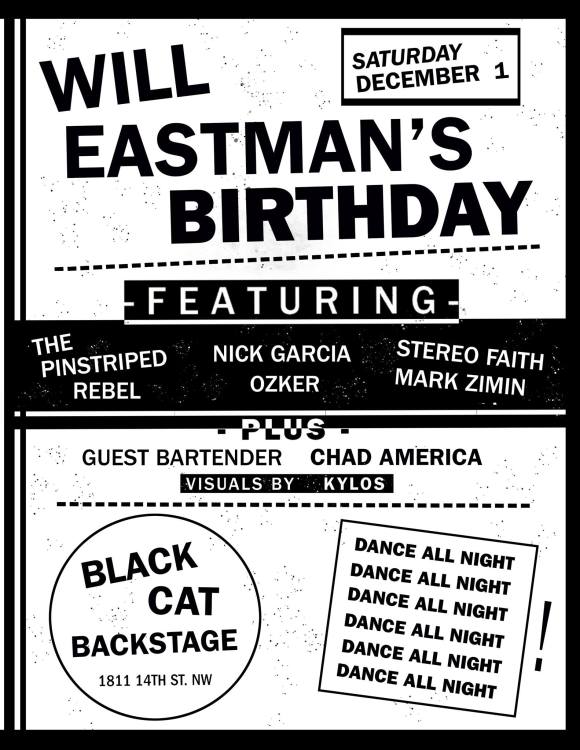 If you’re feeling more boogie, less rawk, celebrate DC’s top DJ Will Eastman’s birthday at the Black Cat Backstage. With a lineup including Stereo Faith, Ozker, Nick Garcia and more, and drinks by Chad America, you can dance until your legs give out.