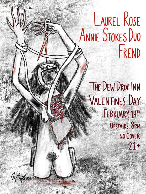 Welp, it’s Valentine’s Day. Do you have a date you want to impress? Are you flying solo and want some tunes to warm your heart? Head to Dew Drop Inn Thursday night for the lineup of experimental rock band Frend, folky Annie Stokes Duo, and a solo set from Laurel Rose of Bal Boheme.