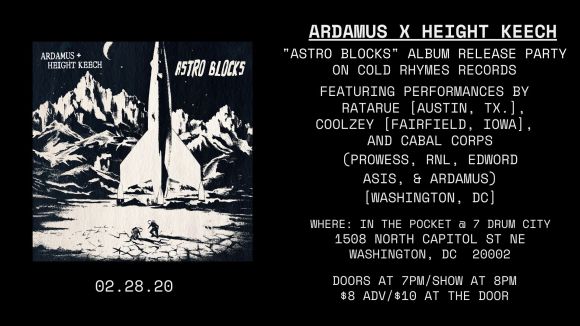We saw rapper Ardamus post up at the Time Is Fire show last night, and he let us know about his album release show tonight at 7DrumCity’s The Pocket space. Astro Blocks features Height Keech crafting beats for the versatile rapper, and the show includes Austin’s Ratarue, Coolzey from Iowa, and Cabal Corps, Ardamus’s new group featuring Prowess the Testament, RNL and Edword Asis. Now you know all that too, so don’t miss out.